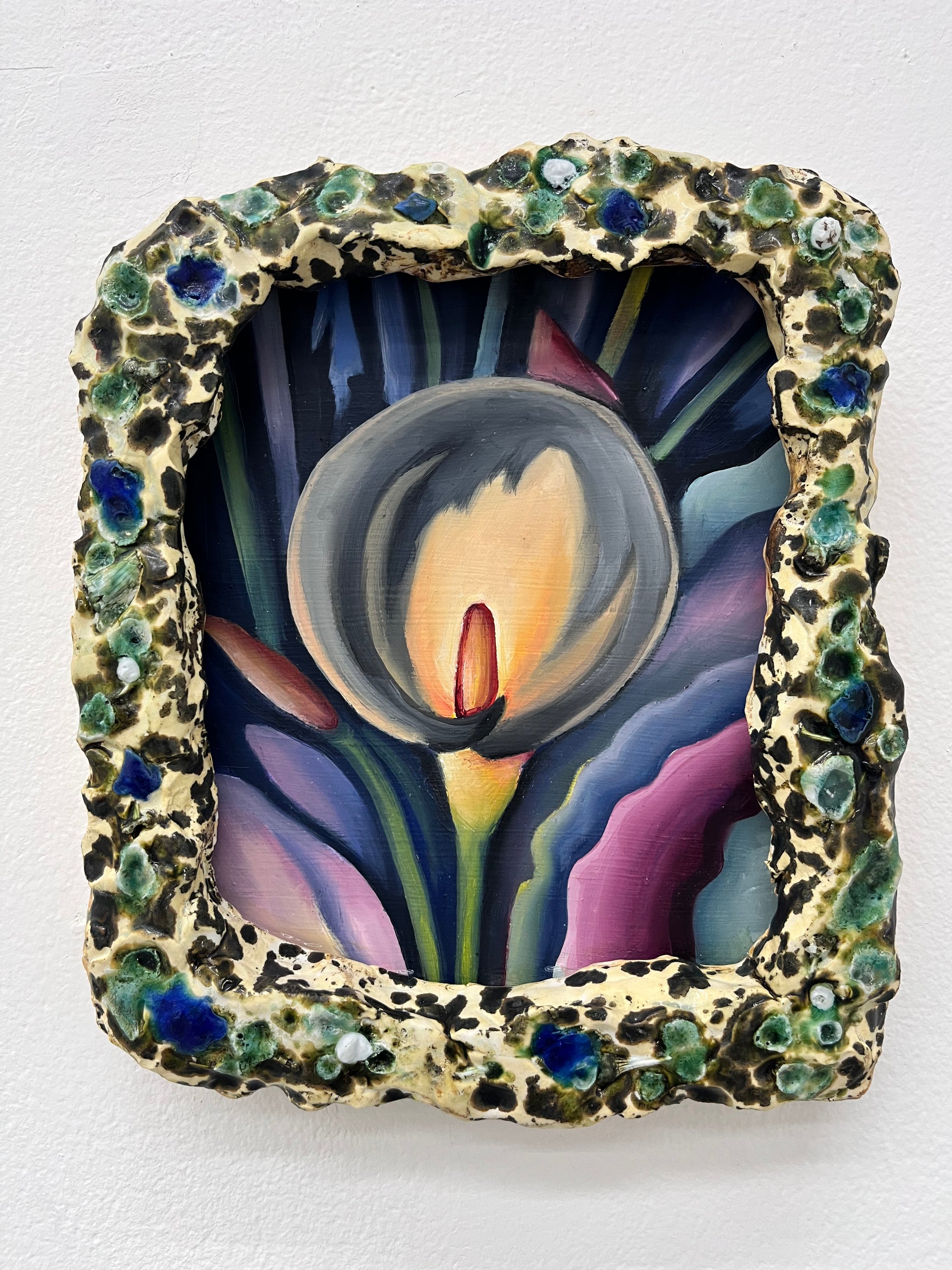 Acrylic and oil on panel, glazed ceramic frame